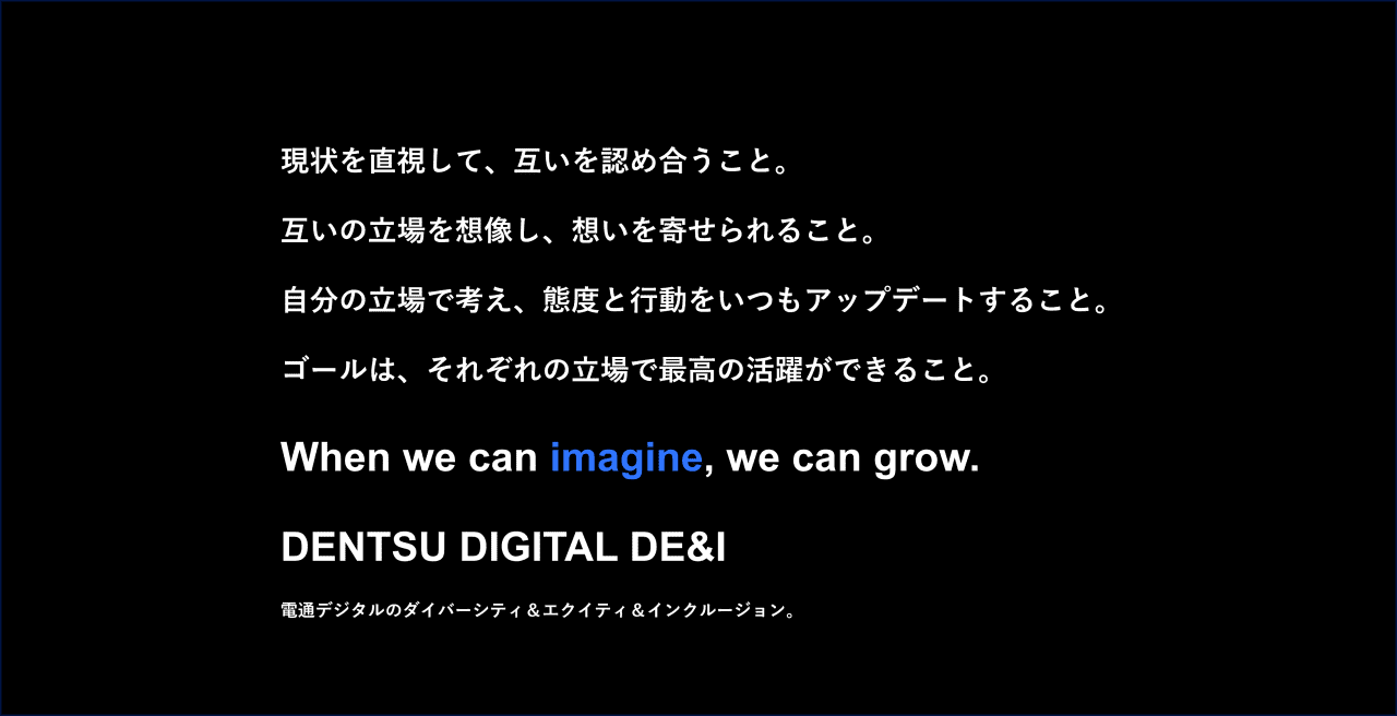 DE&Iのステートメントの中に「When we can imagine, we can grow.」という一文があります。誰もが相手の状況をもう少し「Imagine」することで、大きな成果を生み出せると信じています。