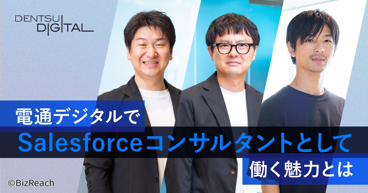 IT導入やDX(デジタルトランスフォーメーション)といった面で課題を抱えるさまざまな企業にコンサルティングを行い、課題解決に導く電通デジタル。数あるソリューションのなかでも同社が注力しているものの一つが、Salesforceを活用したコンサルティング事業です。現在、事業の拡大を見据えてコンサルタントの募集を強化しています。大規模プロジェクトの機会も多い電通デジタルだからこそ経験できる案件をはじめ、その仕事の魅力について3名の社員にお話を伺いました。