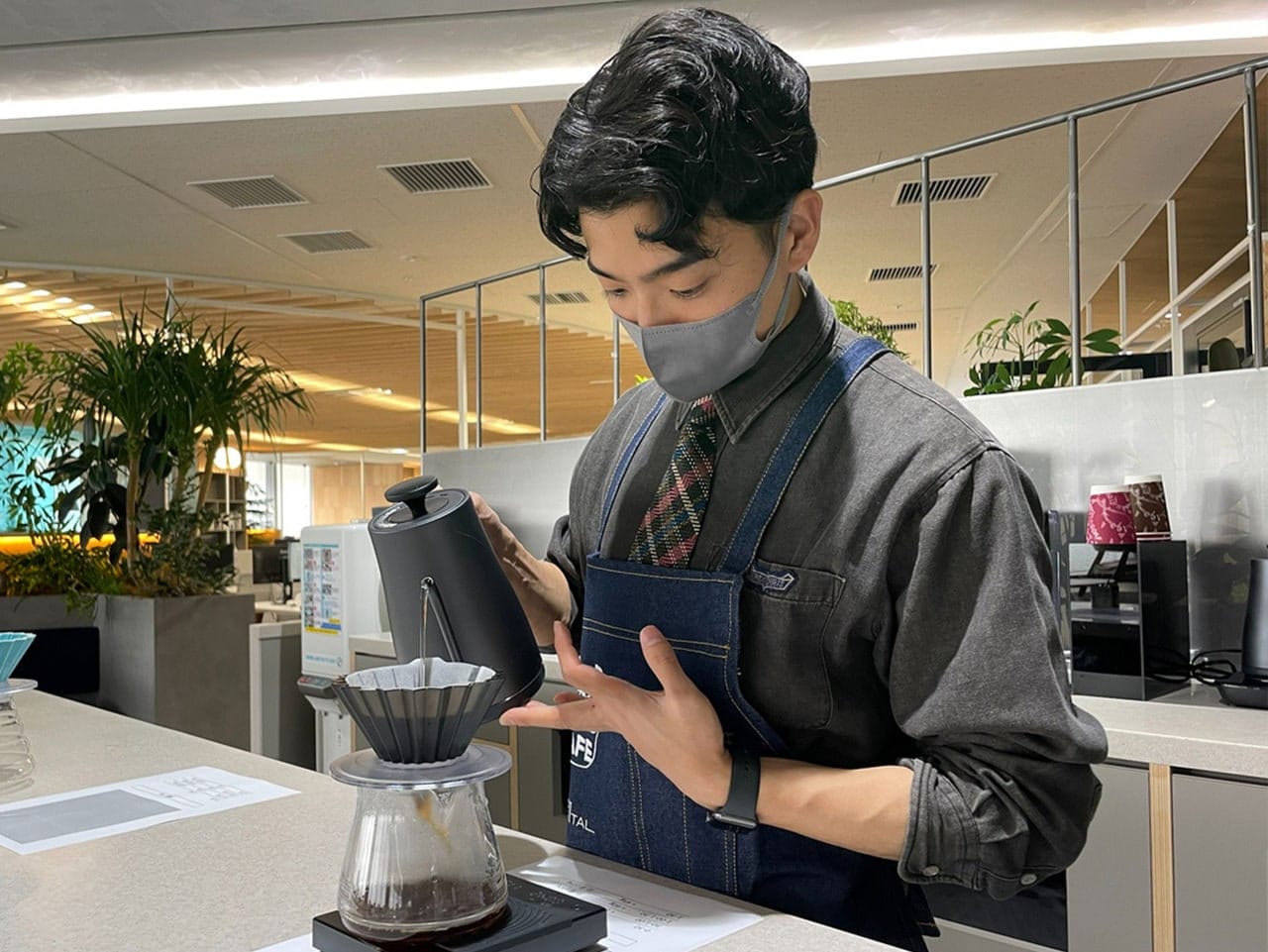 永田:電通デジタルには、2018年度から「サークル制度」があります。スポーツや音楽など、共通の趣味嗜好を通じて交流を深めるコミュニティーです。私はその中でコーヒーサークルを設立し、代表を務めています。元々は、カフェに行って飲み比べをしたり、プロのバリスタを社内に呼んでイベントを開催したりしていたのですが、今ではサークルメンバーが交代でバリスタとしてカウンターに立ち、コーヒーをふるまうように。総務とも連携して、部署や年代の垣根を越えてさまざまな社員がコーヒーを飲みに集まる、公式の社内イベントになりました。