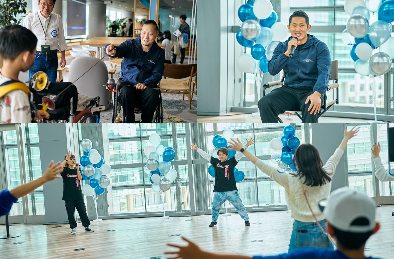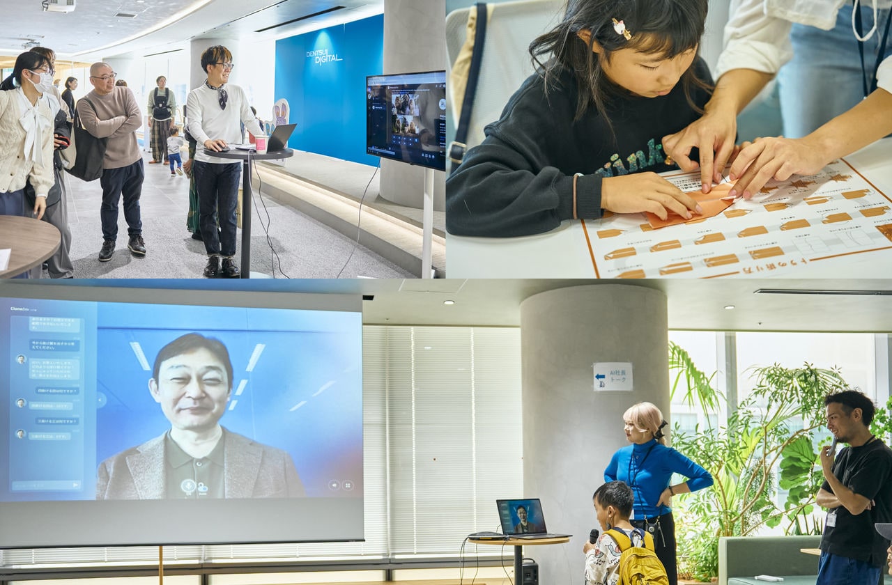 当日は、電通デジタル汐留オフィスの6階から8階の3フロアを使い、さまざまなコンテンツが提供されました。電通デジタルに所属するパラアスリートとの交流会や、手話ダンスワークショップなどのDEI(ダイバーシティ、エクイティ、インクルージョン)を意識したもの、AIでイラストを書いたり、社長の瀧本恒のバーチャルヒューマンとトークが楽しめたりといった、電通デジタルならではの最先端テクノロジーを体感できるコーナーも。