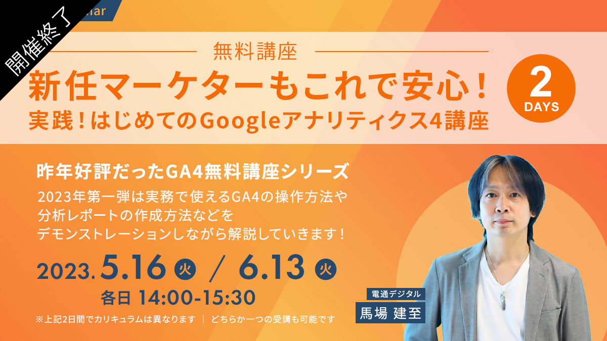 昨年好評だったGA4無料講座シリーズ。 2023年第一弾は実務で使えるGA4の操作方法や分析レポートの作成方法などをデモンストレーションしながら解説していきます!