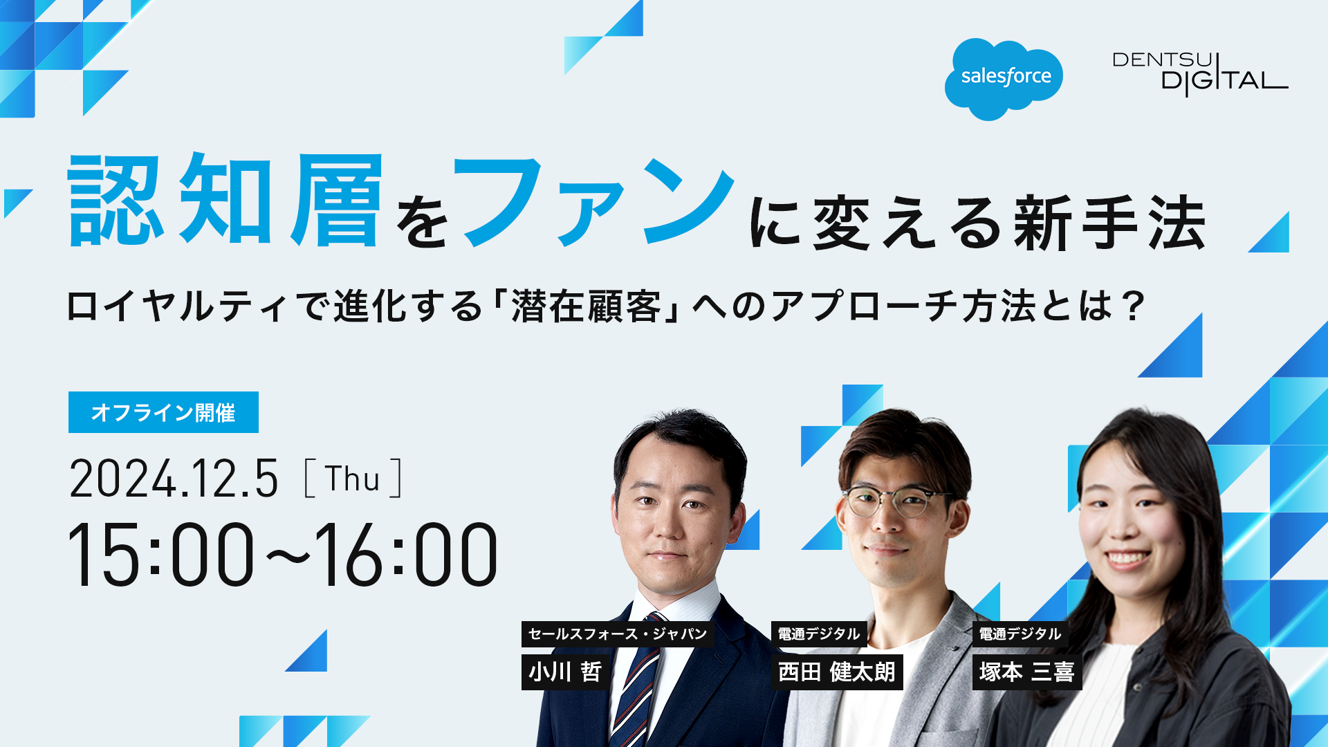 本セミナーでは、潜在的な顧客層を顕在的な「ファン」に育てていくための手法として、「ロイヤルティ管理」をご紹介します。顕在化した顧客とのアプローチ方法の違いや、電通デジタルが過去にご支援した企業の実際のお取組みを通じて、「ロイヤルティ」の概念が潜在顧客を「ファン」に変えるために及ぼす影響力について説明します。