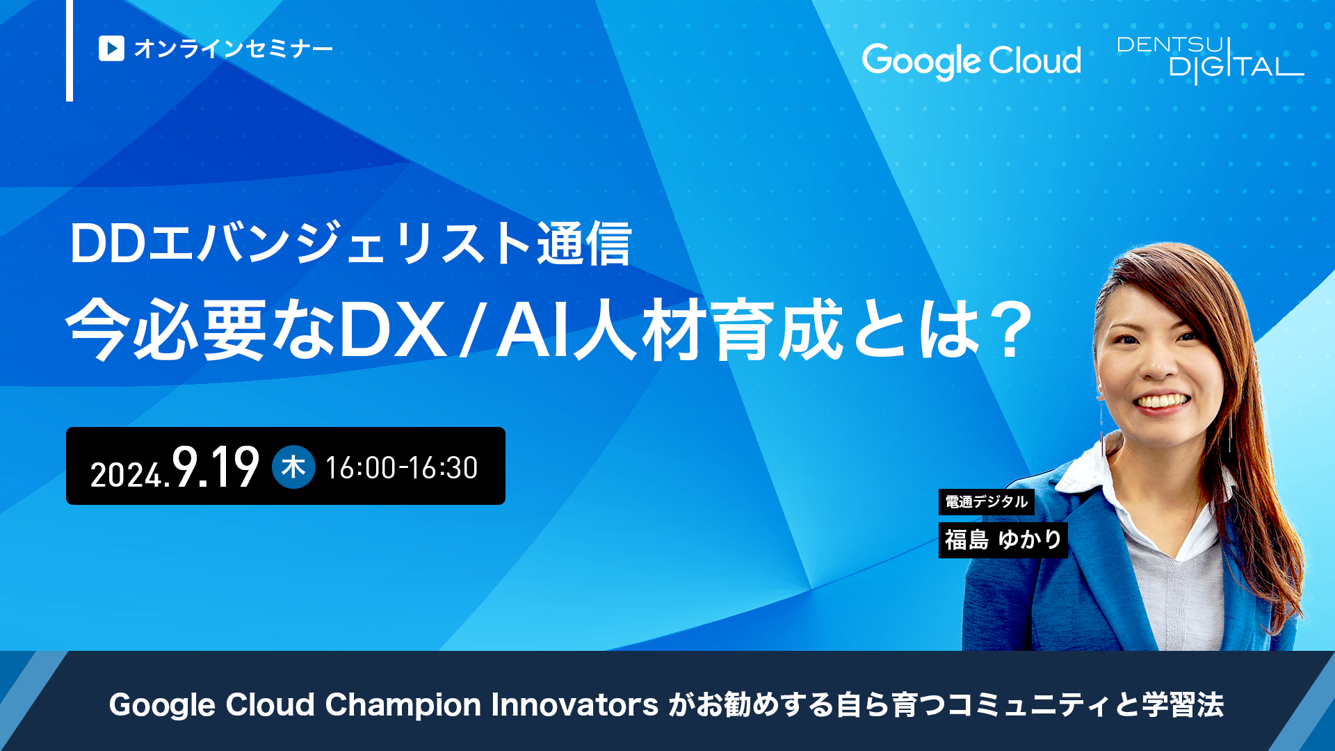 本セミナーでは、Google Cloud Champion Innovators※/ Google Cloud エバンジェリストとして活動する電通デジタルの福島より、市場の最新情報をお伝えするとともに、電通デジタル独自のスキームや実績を生かしたユースケースを毎月ご紹介していきます。