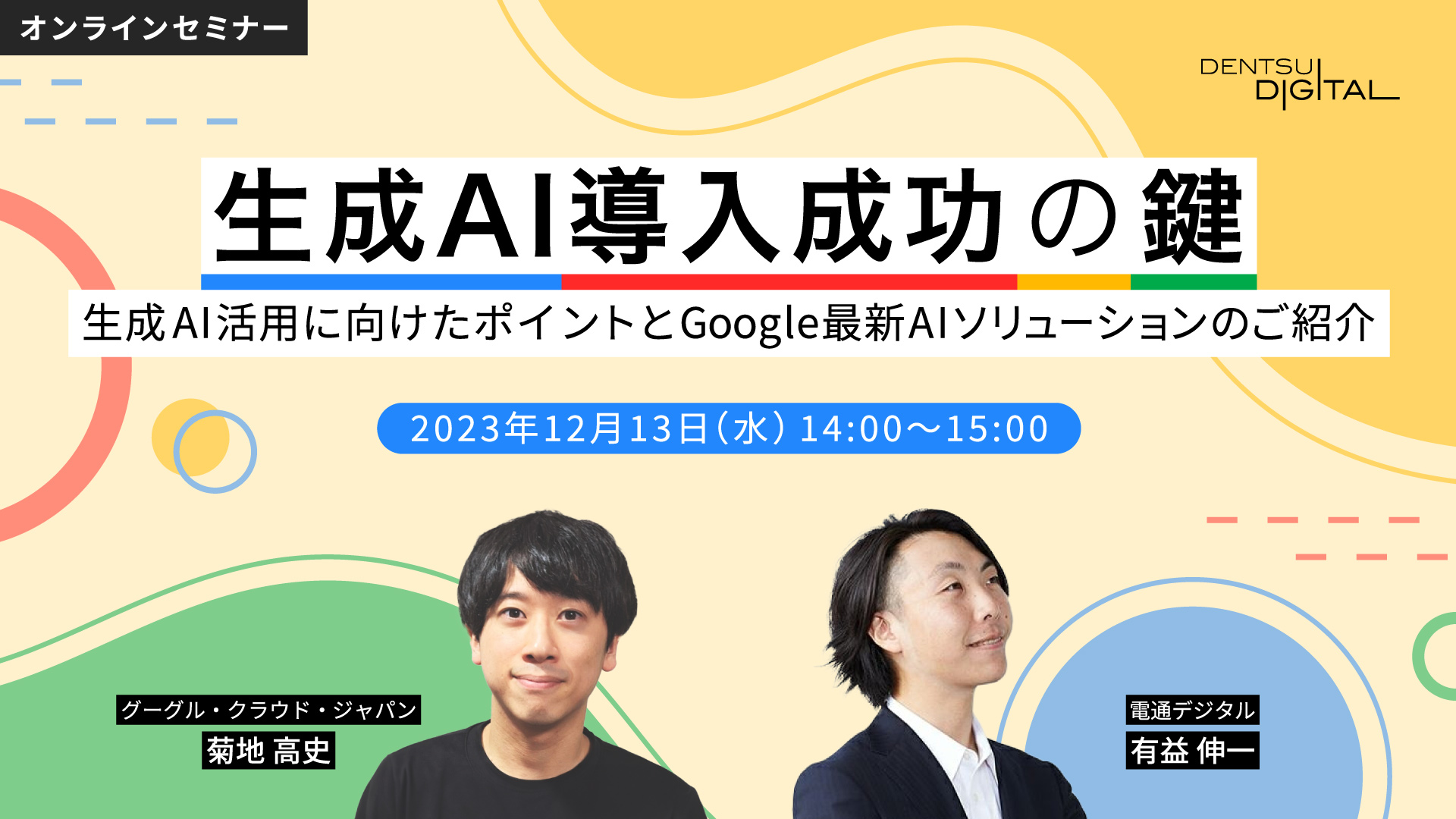 本セミナーでは、第1部で生成AIの導入を成功に導く重要なポイントについてお伝えすると共に、グーグル・クラウド・ジャパン合同会社 菊地高史氏をお招きし、Google Cloudの生成AIソリューションのご紹介、活用事例についてお話いただきます。