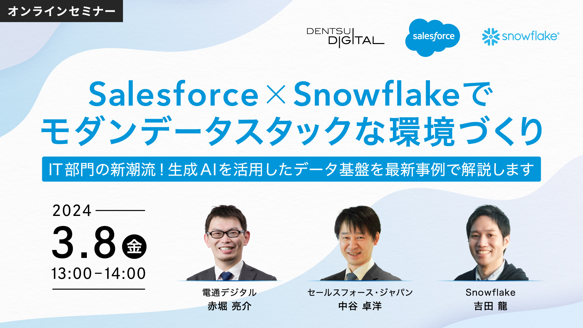 電通デジタル/セールスフォース・ジャパン/Snowflakeのデータ基盤の構築・活用事例とそれを支える製品や技術をご紹介。モダンデータスタックな環境の構築方法や、これから生成AI、データ基盤の導入検討・活用をしていくための課題解決のヒントを解説します。