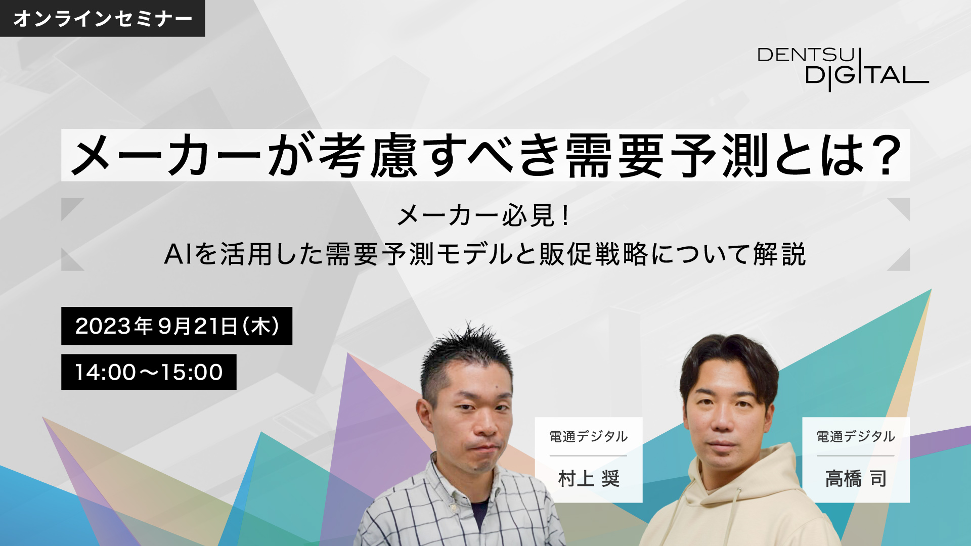 電通デジタルでは、メーカーや自社が保有するデータを活用した需要予測の構築・販促戦略の立案に加え、AIの活用を行なうことで企業の支援を行ってきました。本セミナーでは、その事例を交え、メーカーならではの AIを活用した需要予測および販促について解説します。
