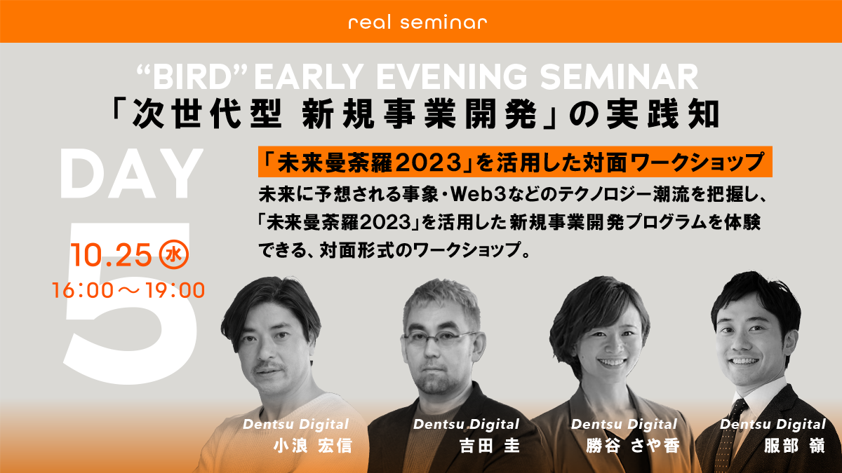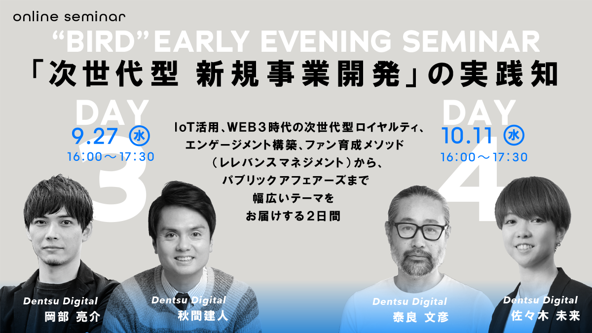 「0」→「1」を生み出す新規事業開発を成功に導くメソッドについて、豊富な知見を有する専門家集団である「電通デジタルBIRD」の実践事例を踏まえながら、”次世代型”の新規事業立ち上げにおけるアイディエーション方法や、成果を出すための推進方法とその具体的なステップ、推進する上でのポイントをより実践に近い内容でご紹介します。