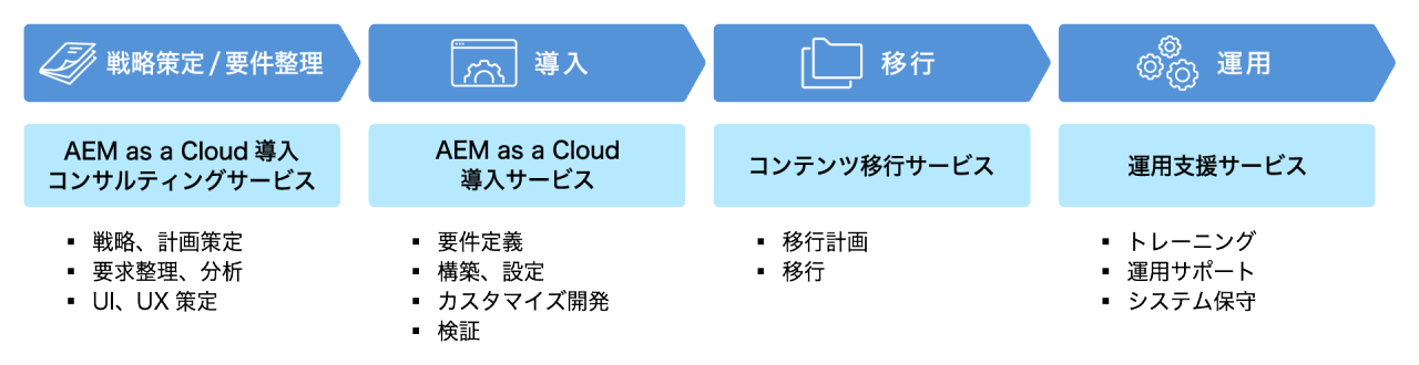 | 4 | 運用支援サービス | 運用支援サービスでは、企業がAEMを効果的に管理・運用できるよう包括的にサポートします。運用者向けトレーニングやサポートで専門知識を強化し、システム保守と迅速なトラブルシューティングで管理負担を軽減し、ビジネスの継続性を確保します。 |