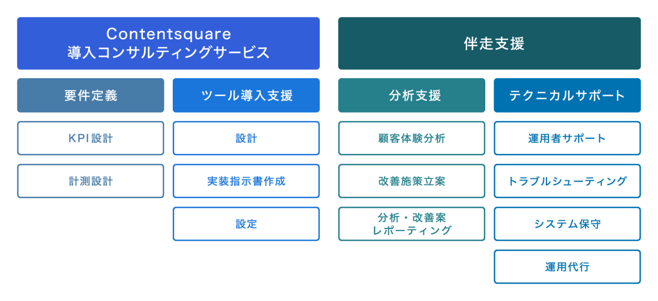 電通デジタルでは、Contentsquareの導入準備から設定・運用・分析・改善まで、幅広くサポートを行っています。