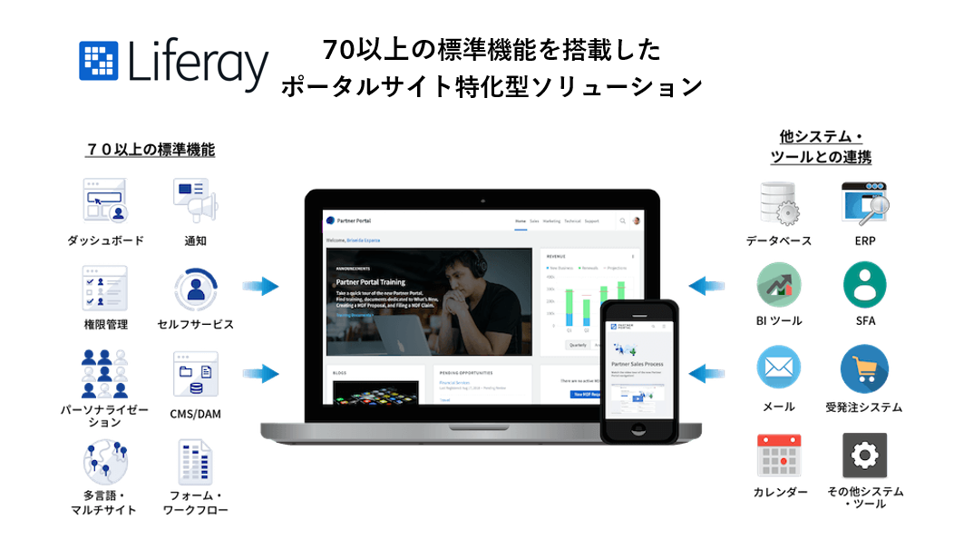 | 高いシステム統合力 | 多くのシステム・ツールとの互換性があるため、ベンダーロックインを心配する必要なくポータルサイトとのシステム統合が可能です。SOAP、REST、GraphQL、RSSのほか独自仕様のAPIとの統合もサポート。社内に散らばったシステムやデータを1つのプラットフォームにまとめることができます。 |