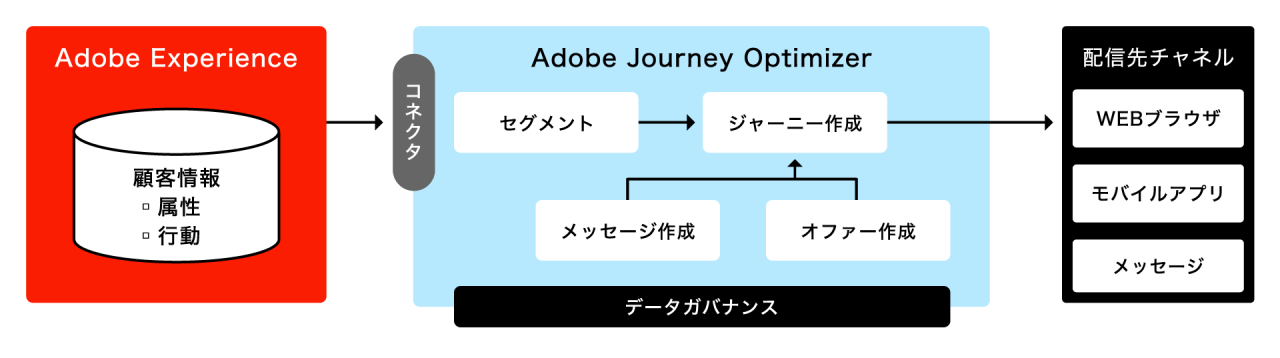 Adobe Experience Platformを活用してさまざまな顧客データを統合・分析ができます。その中でAdobe Journey Optimizerは、収集したデータをもとにパーソナライズしたメッセージ・ジャーニーを設計・管理し、複数チャネルでメッセージを自動配信するサービスです。