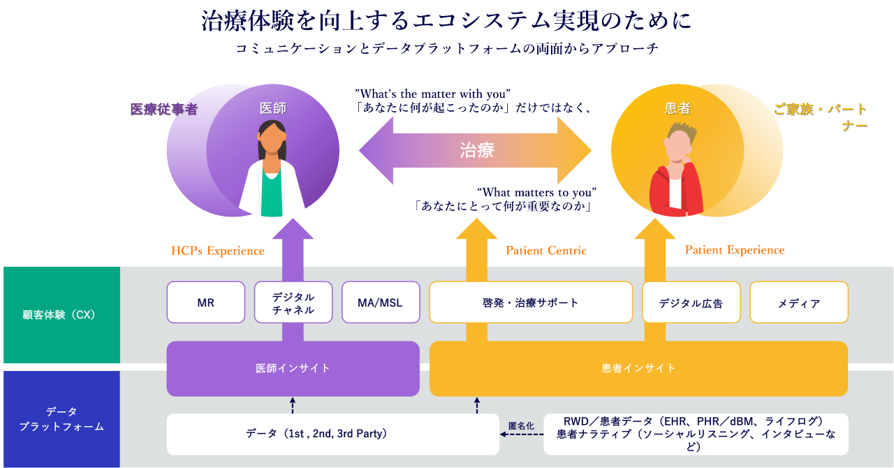 治療にまつわるデータや患者のデータを元に医師と患者のニーズやインサイトを可視化。データプラットフォームとコミュニケーションの両面からなるソリューション群を通じて、医師・MR・患者それぞれの立場から「より良い治療体験」を実現します。さらにプロジェクトのインハウス化に向けたCX専門家による人材育成・組織開発支援プログラムをご提供しています。