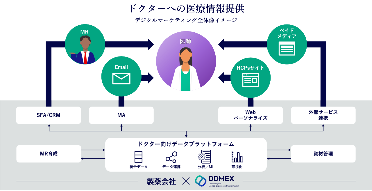 MR活動のデジタル化支援、オムニチャネルによるデジタル接点の強化と拡張、医師データの統合/活用を軸とした、データマーケティング、プラットフォームに特化したソリューション群です。
