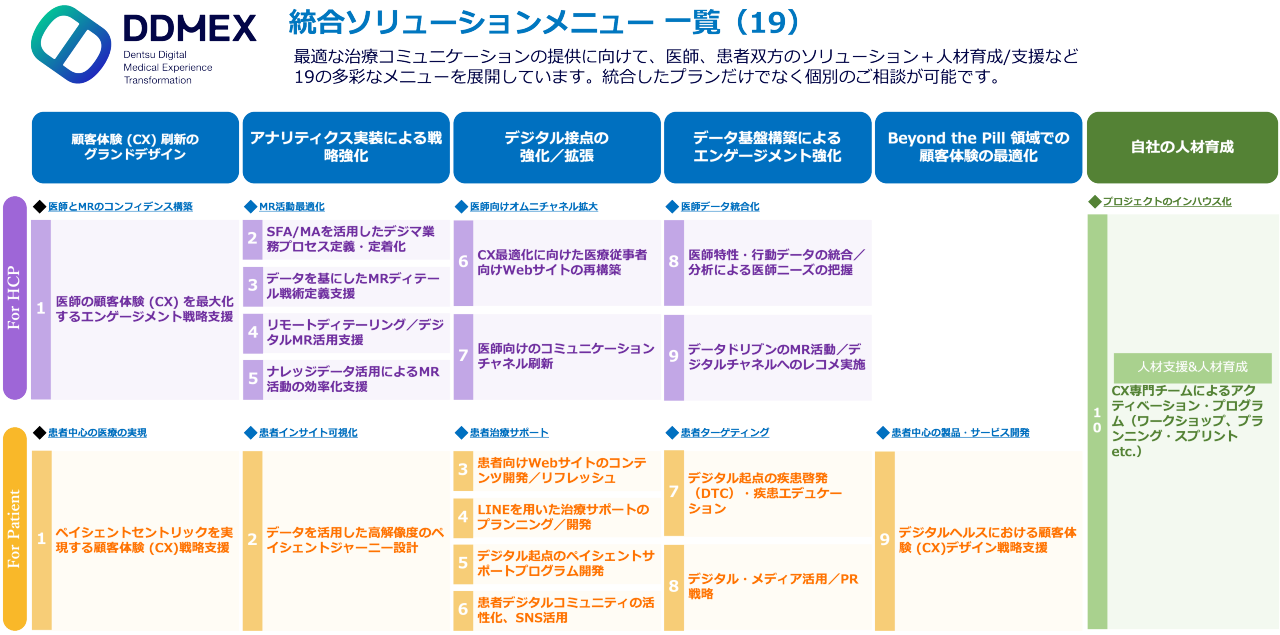 患者のCX(顧客体験)理解からあるべき姿の導出、Webサイトなど自社コンテンツのCX改善、患者の治療体験を軸とした事業戦略、体験設計やクリエイティブ開発などコミュニケーションに特化したソリューション群です。