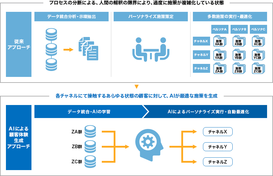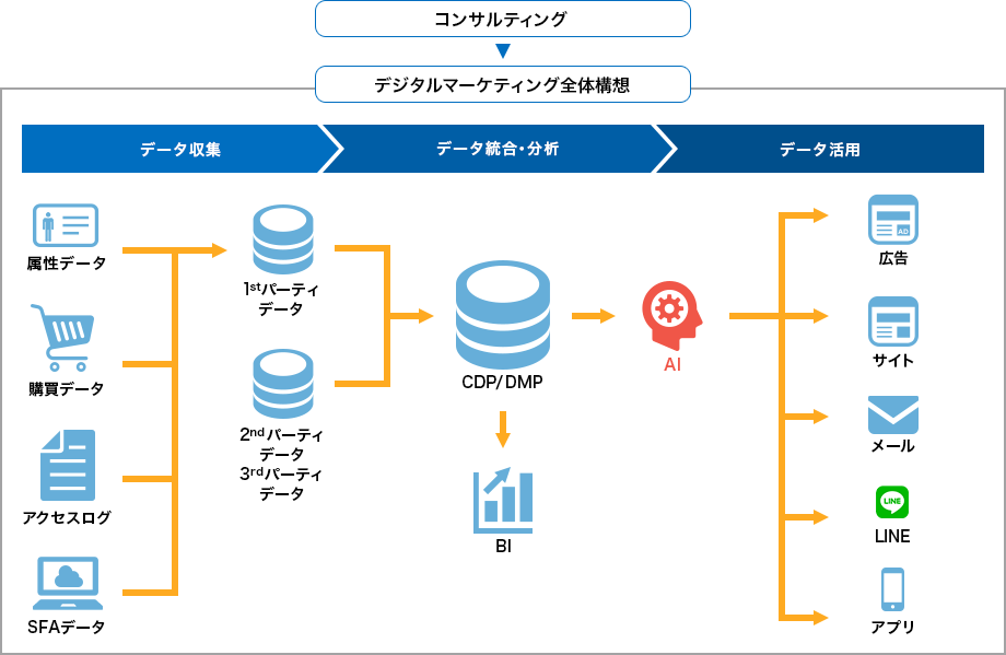企業が生活者に対し、最適なメッセージを最適なタイミングで最適なチャネルを通じコミュニケーションをするために、顧客の属性・行動・購買・興味関心・位置情報等のデータを「AI」に学習させ、その結果や示唆を様々なマーケティングテクノロジーと連携させる包括的な支援を行います。