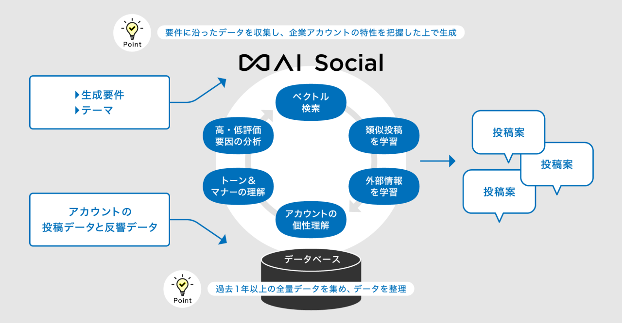 ∞AI Socialは、企業SNSのアイデンティティをAIが学習し、エンゲージメント獲得に貢献する投稿文案を生成するソリューションです。