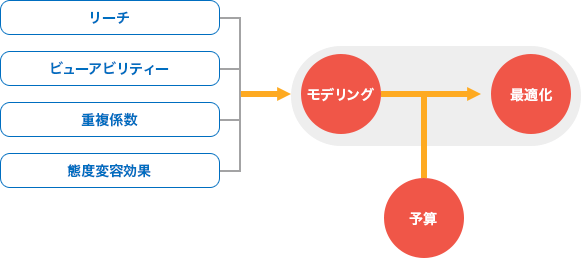 また、アドフォーマットや業種、ターゲットセグメント等、さまざまな要因によって変動する広告効果を、大量のアンケートデータからパターン別のインパクト係数を導出することでリーチ指標だけでなく認知や意向といった態度変容指標での予算配分最適化も実現しています。
