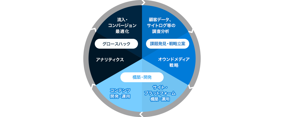 企業のオウンドメディアを最大限にビジネス活用するための戦略立案、Webサイト構築、流入改善、アナリティクス、コンバージョン最適化、PDCA運用などにより、ブランディング向上、顧客満足度向上、売上向上等のビジネスパフォーマンスUPを支援します。また大規模・複雑化を踏まえた体制構築やプロジェクト設計、最新のシステム・テクノロジー活用、さらにはWebサイトを起点とした広告やCRMといった施策との連携をワンストップで柔軟に実現していきます。