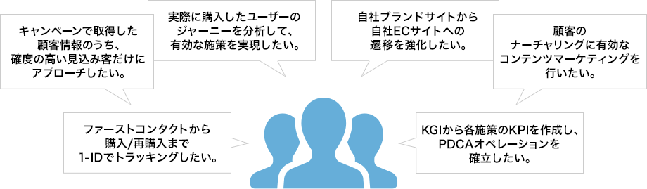 アクセス解析ツールとテクノロジーをフルに活用し、Webサイト上の課題と実行可能な施策を整理することにより、Webサイト来訪者のコンバージョン率を最大化し、ビジネスを改善します。Webログ以外の顧客アセットもフル活用しデータドリブンに課題を特定したうえで、実行可能なDO(打ち手)に優先順位を付け、PDCAを回すことで、結果にこだわったコンバージョンレート最適化を追求します。