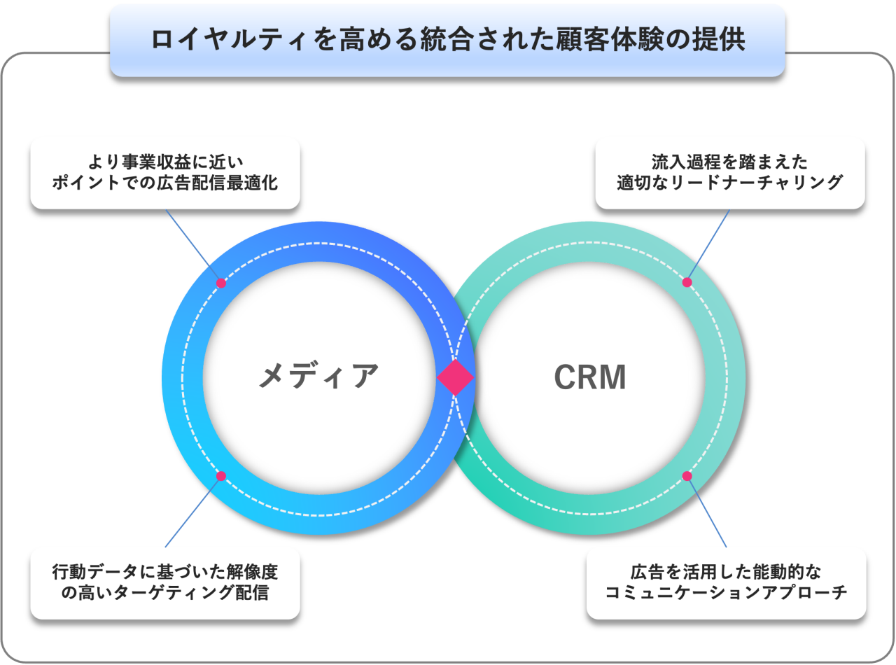 KARTEを用いてメディア領域とCRM領域間で相互にデータを共有し、ソーシャル、広告、実店舗、ECまであらゆるコミュニケーションを含む、チャネルごとに分断されない一貫したCXの提供を実現します。